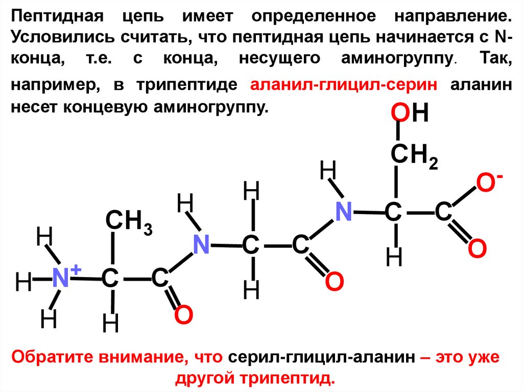 Пептидная цепь имеет определенное направление.Условились считать, что пептидная цепь начинается с Nконца, т.е. с конца, несущего аминогруппу. Так,