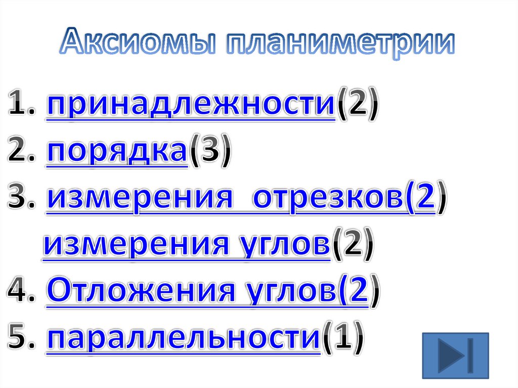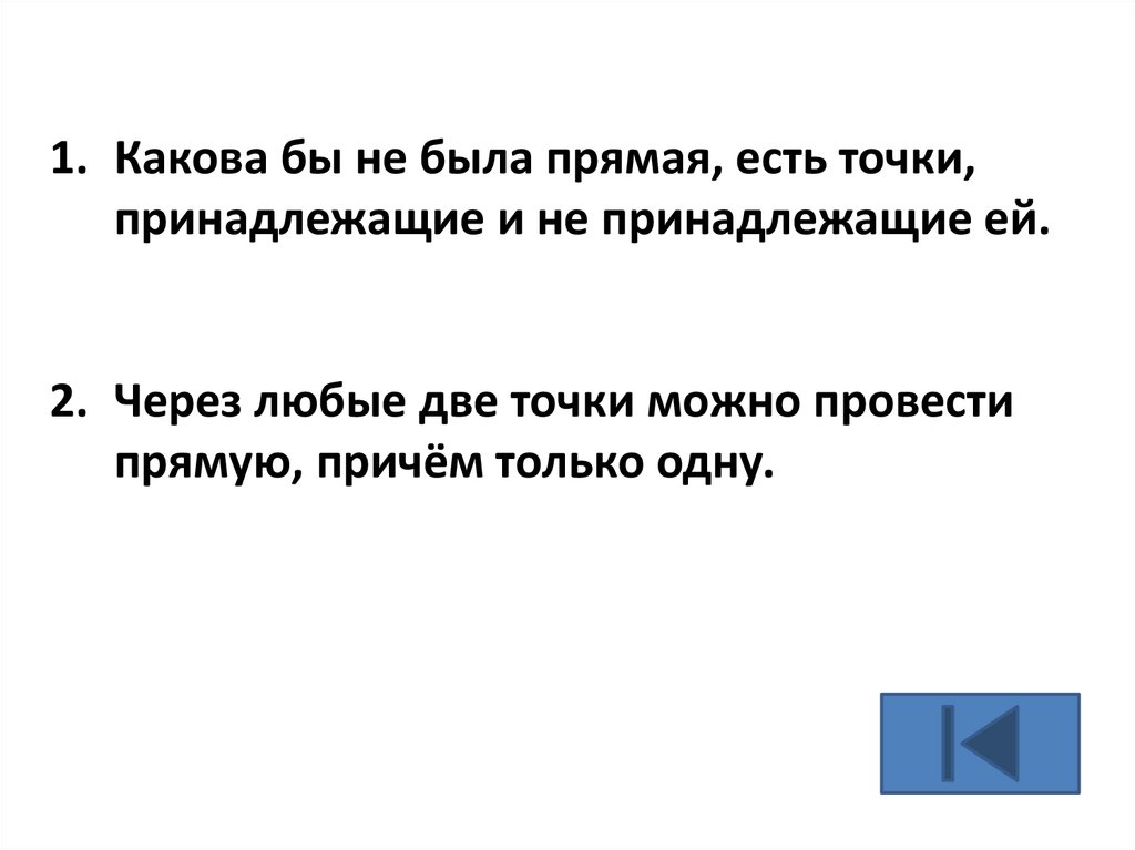 1. Какова бы не была прямая, есть точки,принадлежащие и не принадлежащие ей.