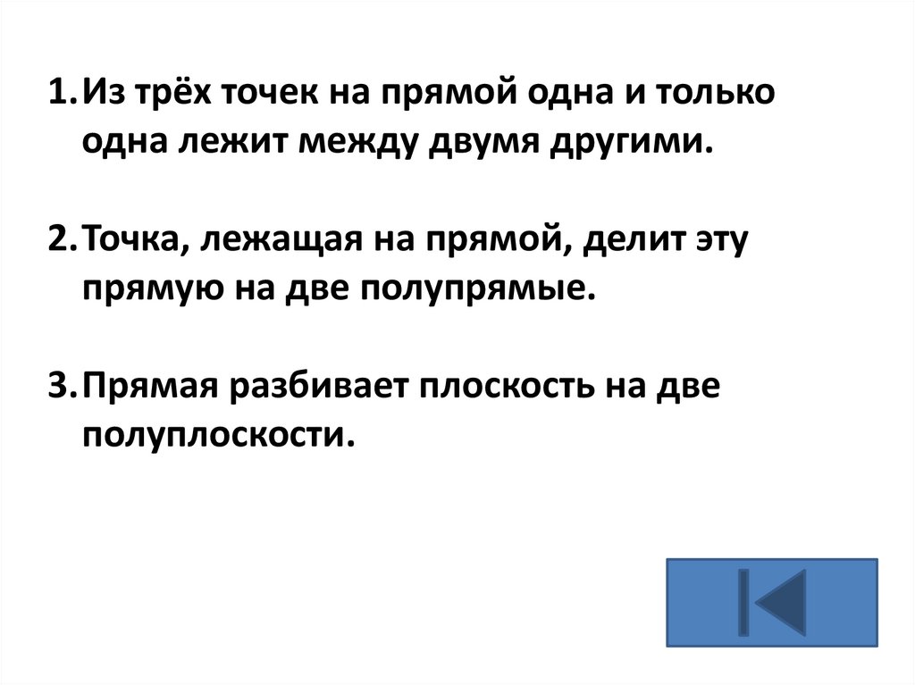 1.Из трёх точек на прямой одна и толькоодна лежит между двумя другими.