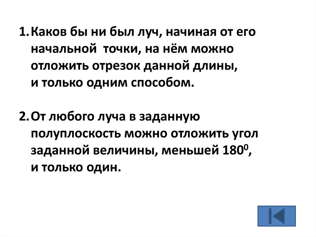 1.Каков бы ни был луч, начиная от егоначальной точки, на нём можно