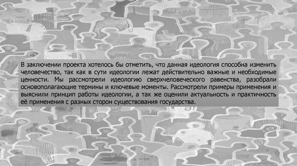 В заключении проекта хотелось бы отметить, что данная идеология способна изменитьчеловечество, так как в сути идеологии лежат действительно важные и необходимые