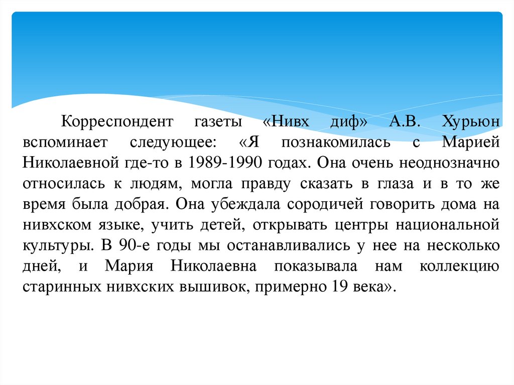 Корреспондент газеты «Нивх диф» А.В. Хурьюнвспоминает следующее: «Я познакомилась с Марией