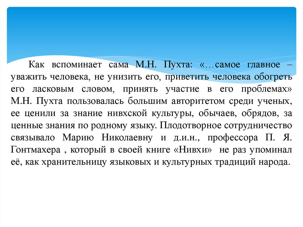 Как вспоминает сама М.Н. Пухта: «…самое главное –уважить человека, не унизить его, приветить человека обогреть