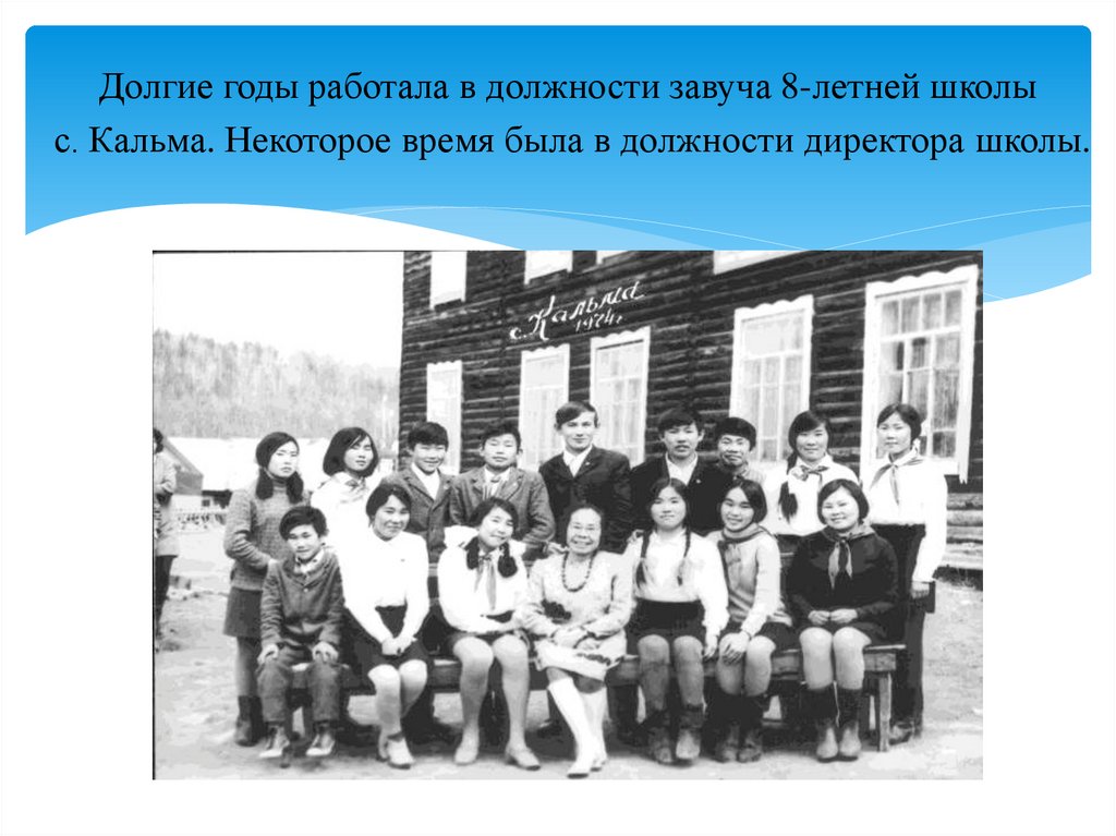3. В 1954 году Мария Николаевна окончила Учительский институт в г. Хабаровске. Вернувшись в родную 8-летнюю школу с. Кальма стала