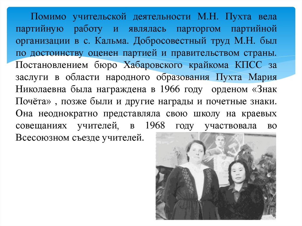 Помимо учительской деятельности М.Н. Пухта велапартийную работу и являлась парторгом партийной