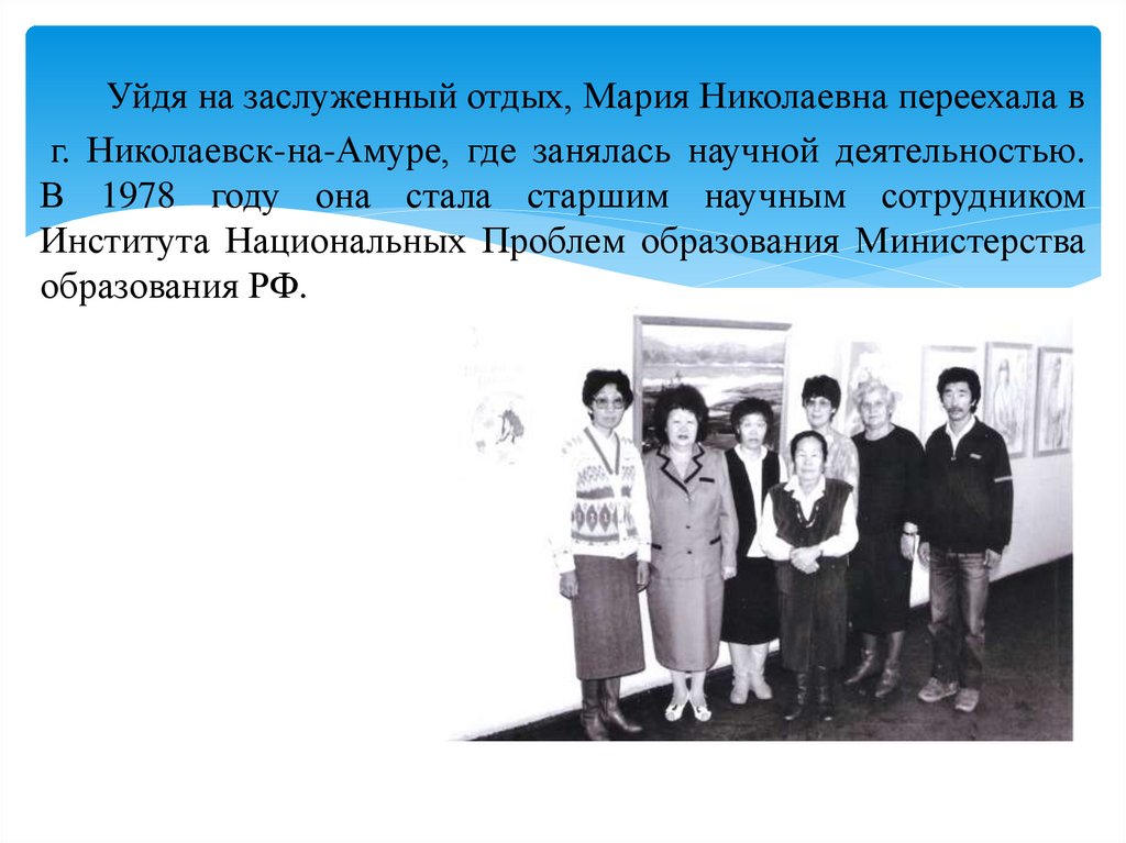 Уйдя на заслуженный отдых, Мария Николаевна переехала вг. Николаевск-на-Амуре, где занялась научной деятельностью.
