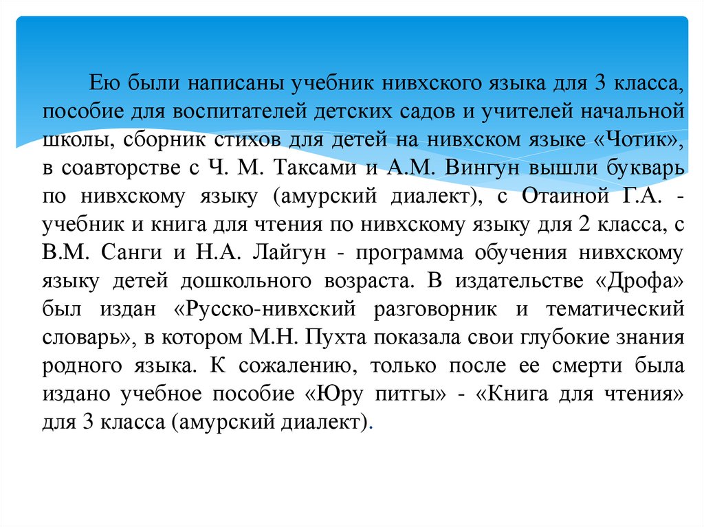 Ею были написаны учебник нивхского языка для 3 класса,пособие для воспитателей детских садов и учителей начальной