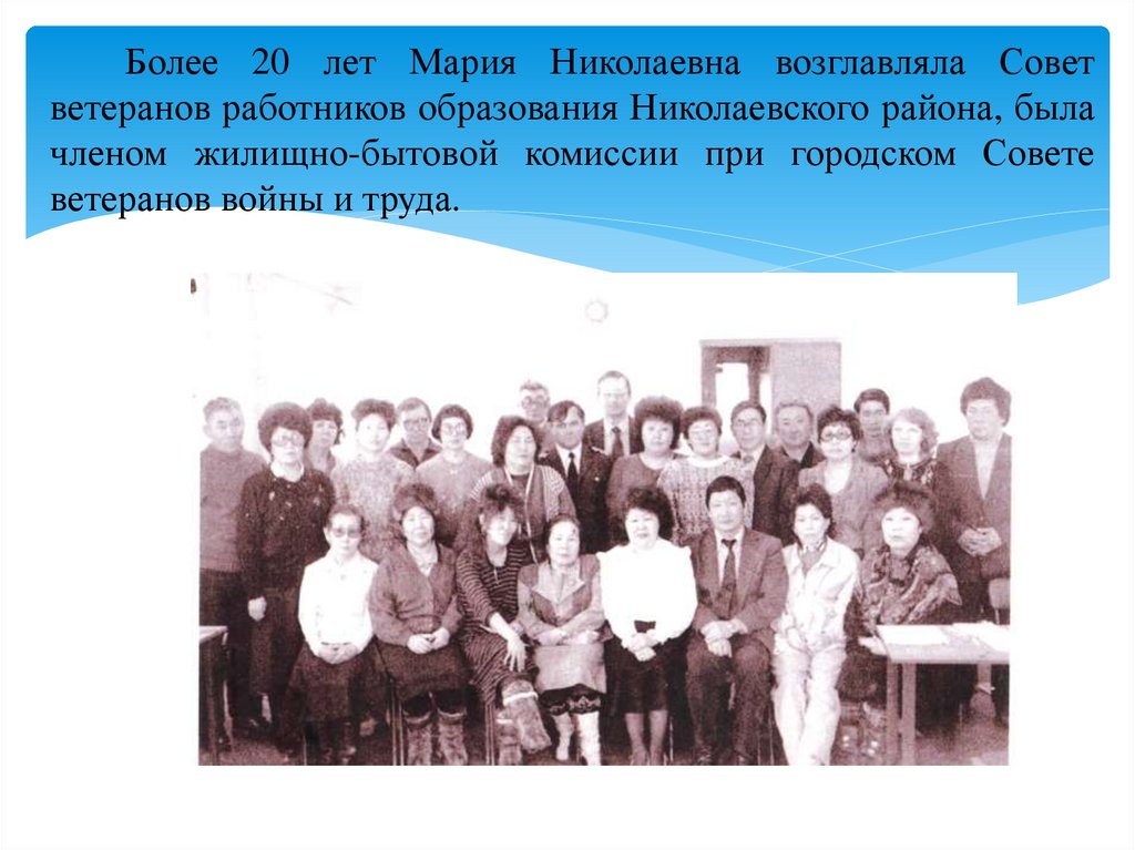 Более 20 лет Мария Николаевна возглавляла Советветеранов работников образования Николаевского района, была
