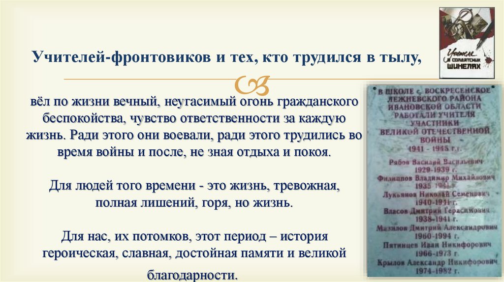 Учителей-фронтовиков и тех, кто трудился в тылу,вёл по жизни вечный, неугасимый огонь гражданского