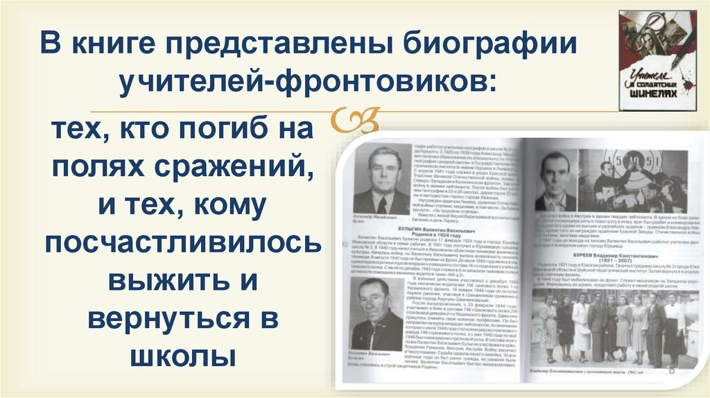 В книге представлены биографииучителей-фронтовиков: