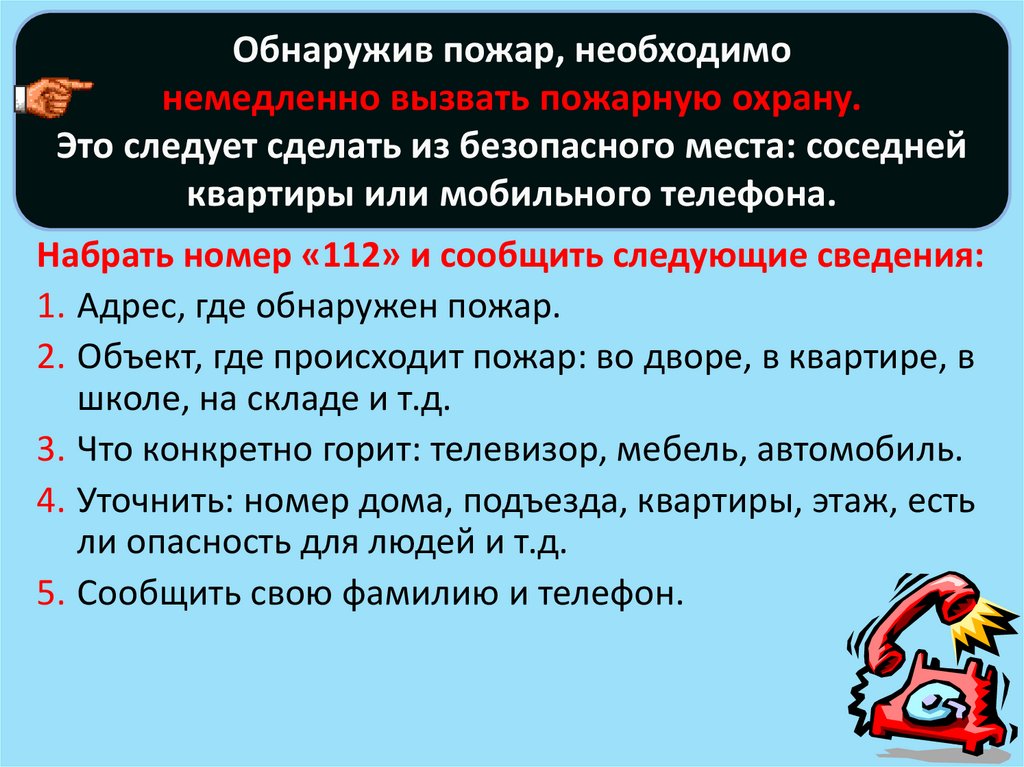 Обнаружив пожар, необходимонемедленно вызвать пожарную охрану.