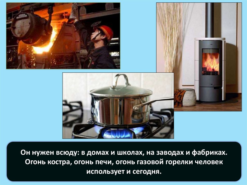 Он нужен всюду: в домах и школах, на заводах и фабриках.Огонь костра, огонь печи, огонь газовой горелки человек