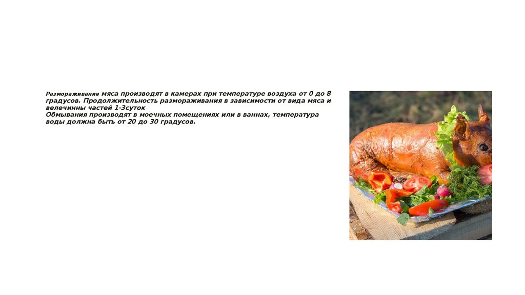 Размораживание мяса производят в камерах при температуре воздуха от 0 до 8градусов. Продолжительность размораживания в зависимости от вида мяса и