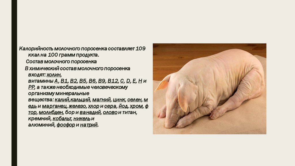 Калорийность молочного поросенка составляет 109ккал на 100 грамм продукта.