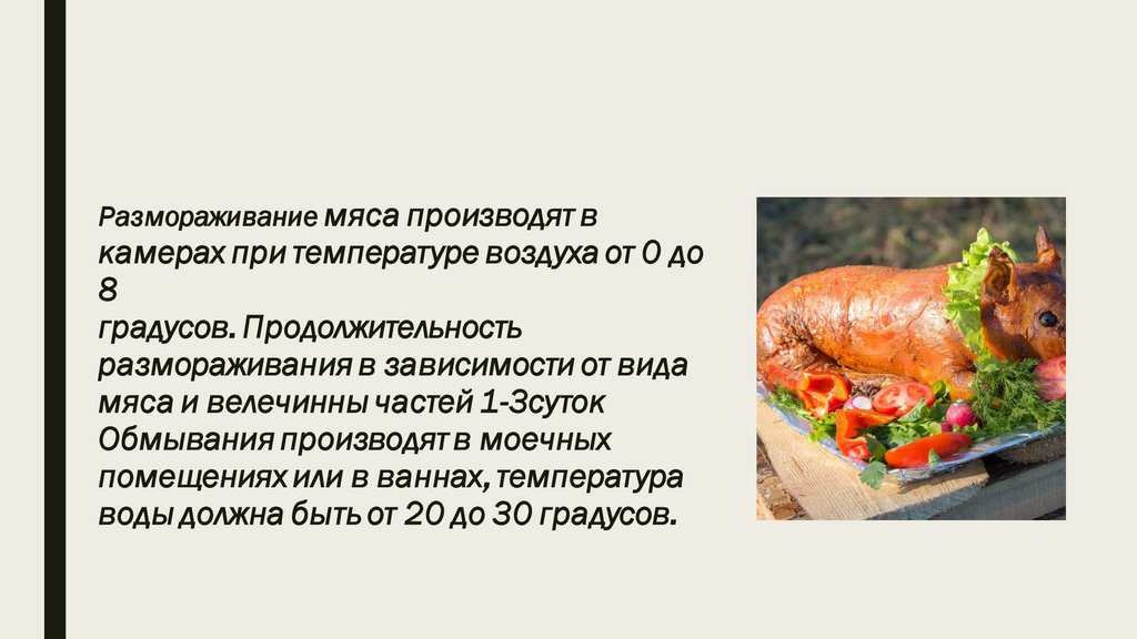 Размораживание мяса производят вкамерах при температуре воздуха от 0 до