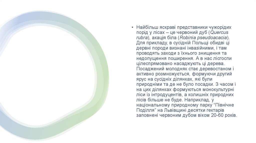 • Найбільш яскраві представники чужорідихпорід у лісах – це червоний дуб (Quercus