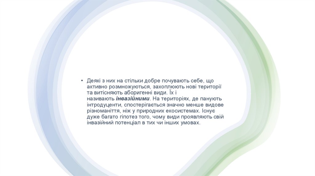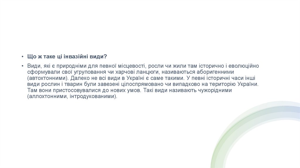 • Що ж таке ці інвазійні види?• Види, які є природніми для певної місцевості, росли чи жили там історично і еволюційно
