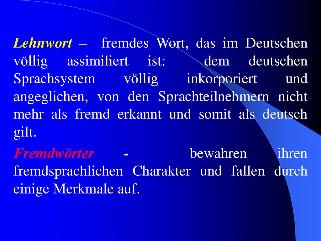 Lehnwort – fremdes Wort, das im Deutschenvöllig assimiliert ist: