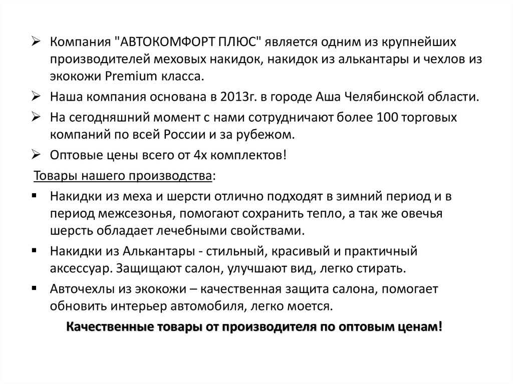 Компания "АВТОКОМФОРТ ПЛЮС" является одним из крупнейшихпроизводителей меховых накидок, накидок из алькантары и чехлов из