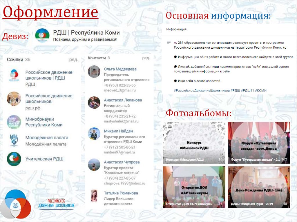 Оформляет группуВыкладывает посты о мероприятиях и событиях,