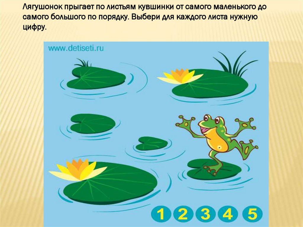 Лягушонок прыгает по листьям кувшинки от самого маленького досамого большого по порядку. Выбери для каждого листа нужную