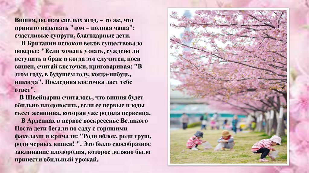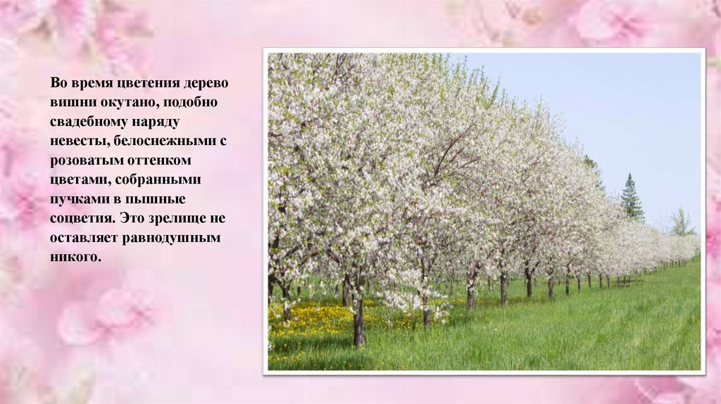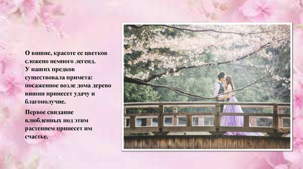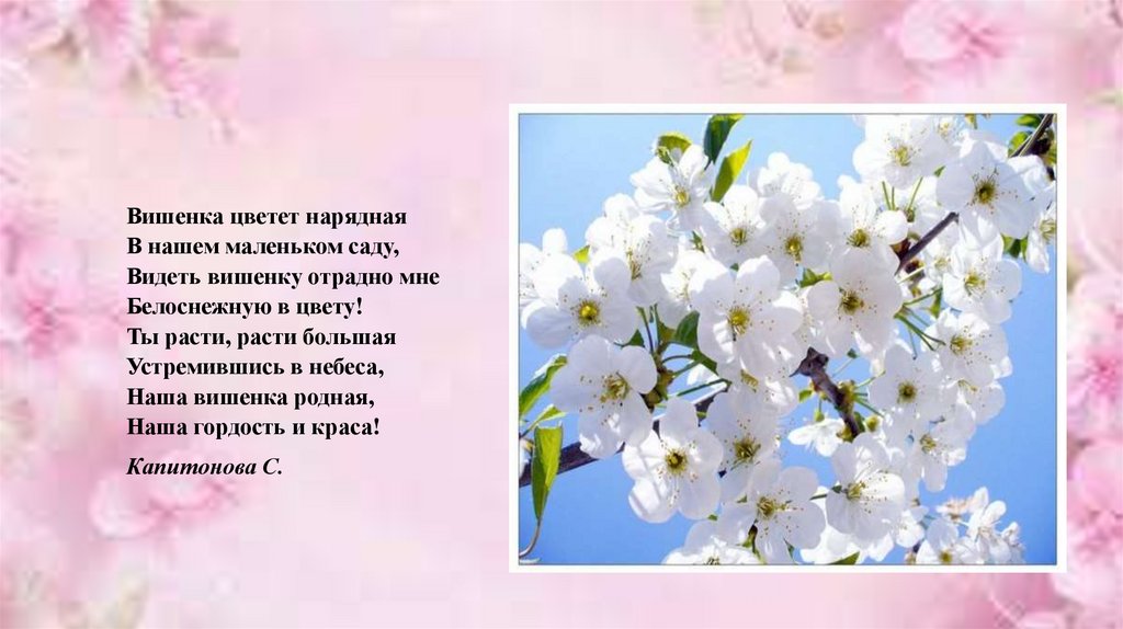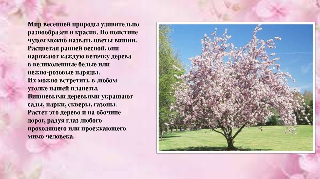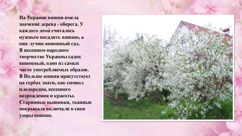 С давних времен и по настоящее время вишневые цветы вызывают восхищение, самыенежные и трогательные чувства. Об этих цветах слагают стихи и поют песни. Художники