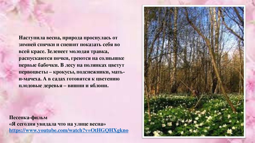 первоцветы – крокусы, подснежники, матьи-мачеха. А в садах готовятся к цветению