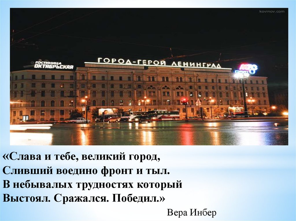 «Слава и тебе, великий город,Сливший воедино фронт и тыл.