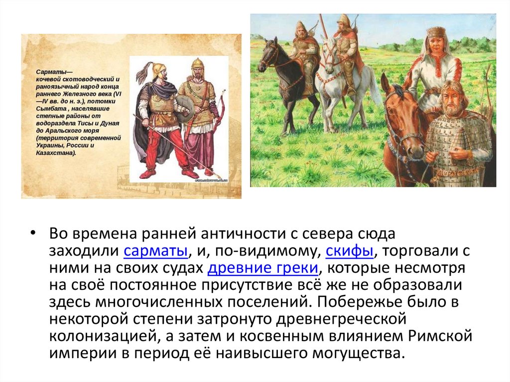 • Во времена ранней античности с севера сюдазаходили сарматы, и, по-видимому, скифы, торговали с