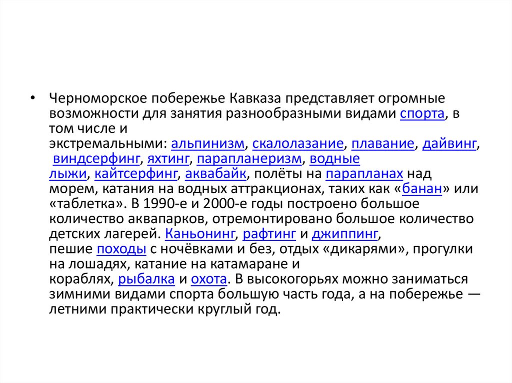 • Черноморское побережье Кавказа представляет огромныевозможности для занятия разнообразными видами спорта, в