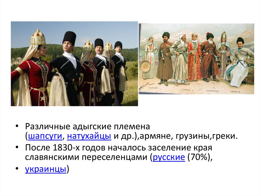 • Различные адыгские племена(шапсуги, натухайцы и др.),армяне, грузины,греки.