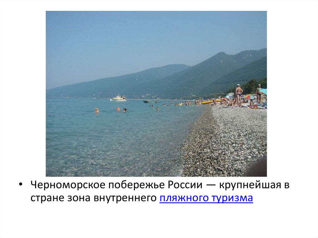 • Черноморское побережье России — крупнейшая встране зона внутреннего пляжного туризма