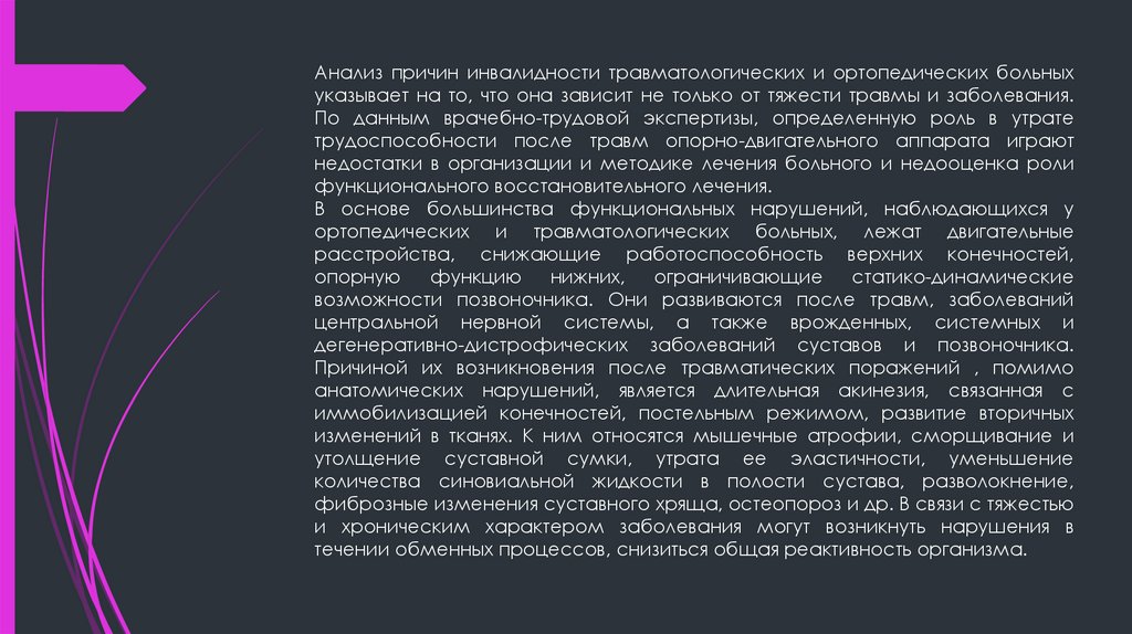Анализ причин инвалидности травматологических и ортопедических больныхуказывает на то, что она зависит не только от тяжести травмы и заболевания.