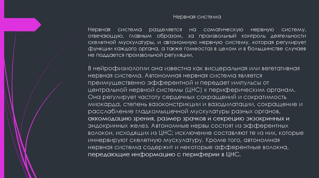 Нервная системаНервная система разделяется на соматическую нервную систему,