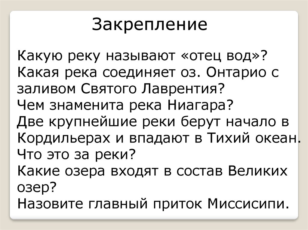 ЗакреплениеКакую реку называют «отец вод»?