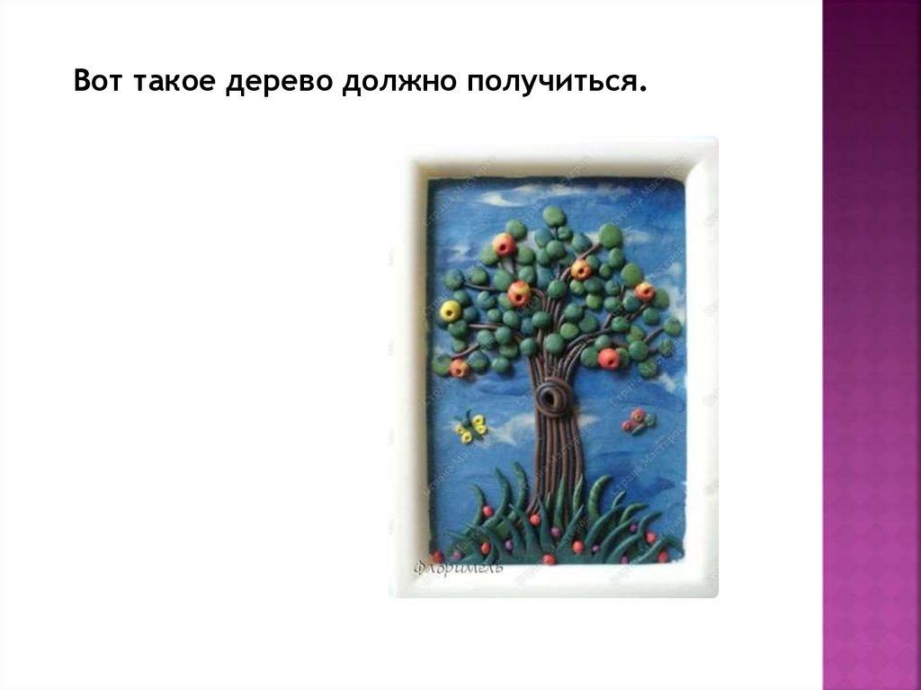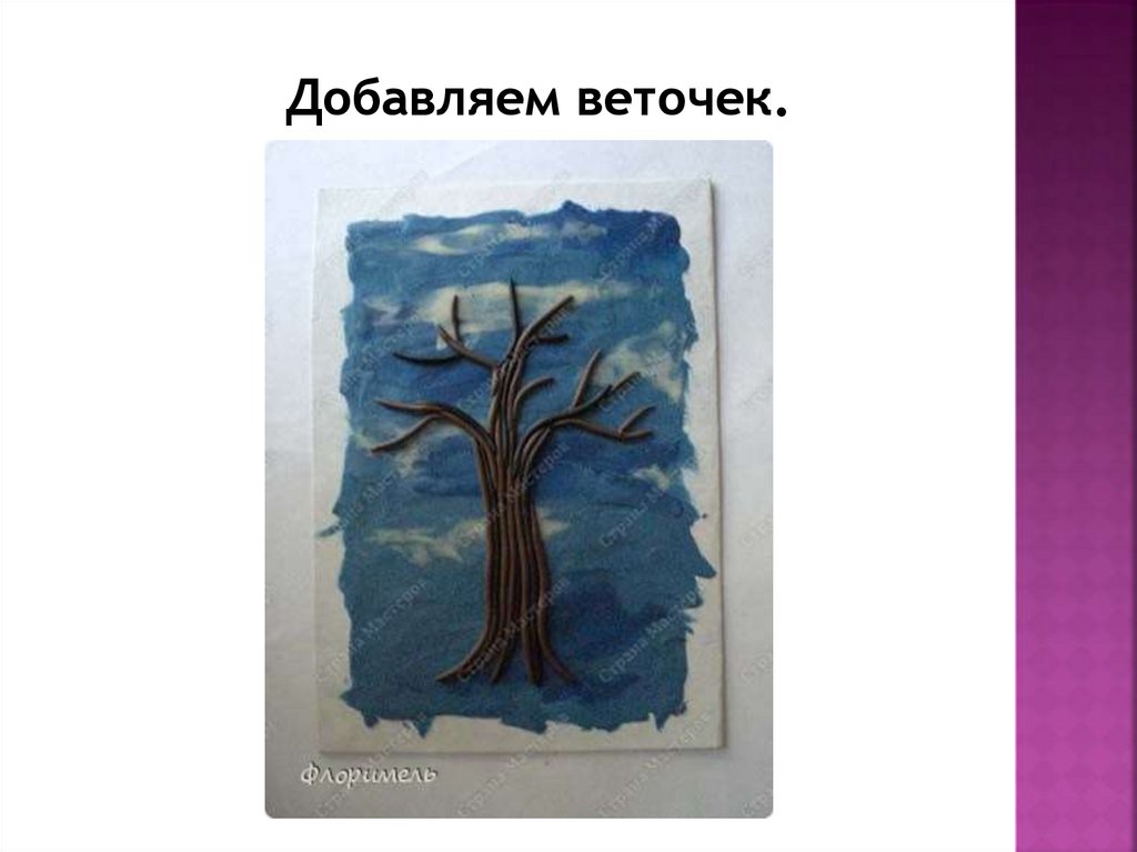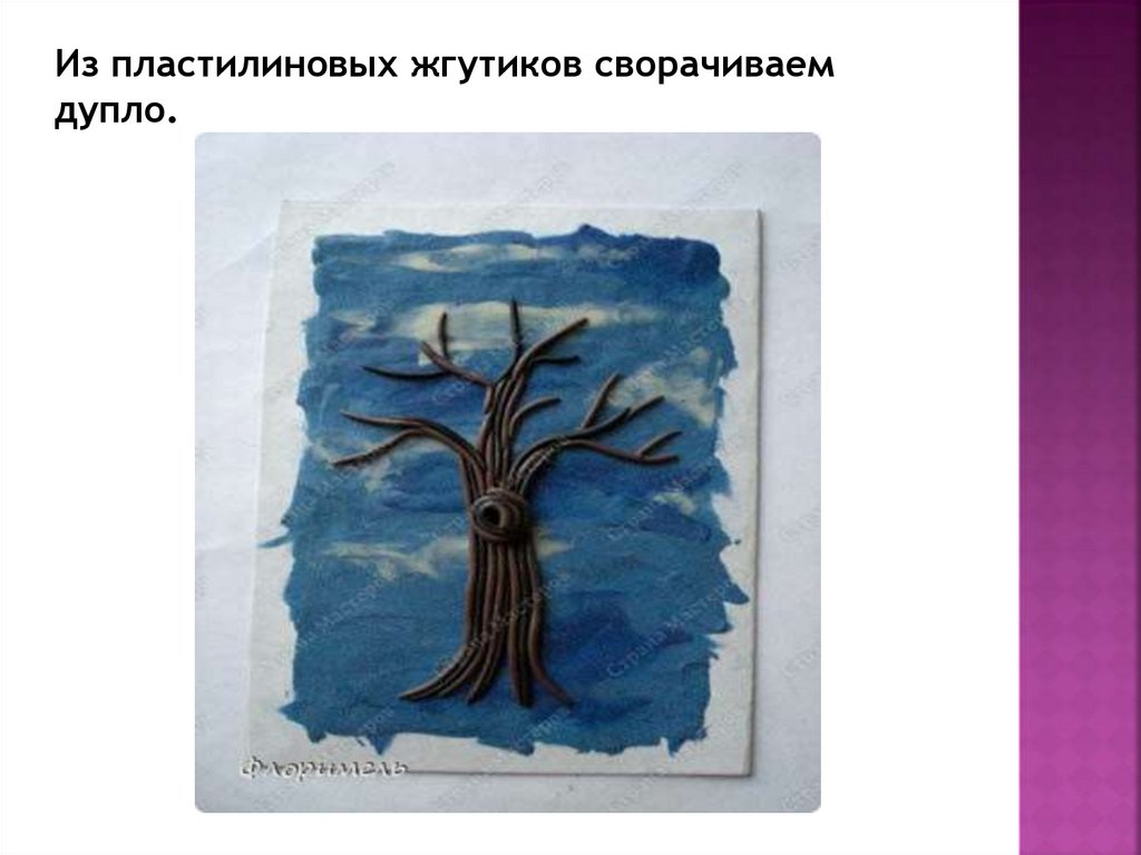 Вдоль веточек придавим зелёные шарики-листики.9. Катая пластилиновый шарик с одного края, формируем капельку. Такими капельками мы скроем корни дерева.