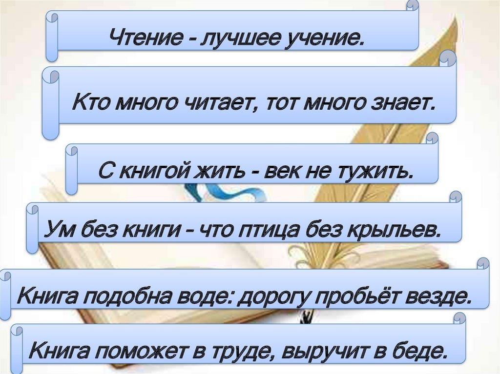 Чтение - лучшее учение.Кто много читает, тот много знает.