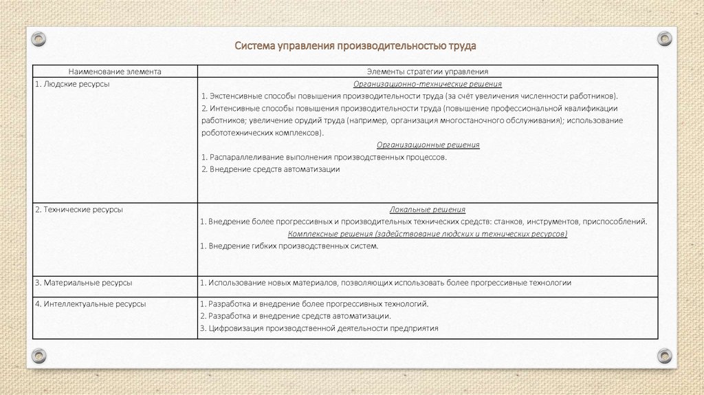 работников; увеличение орудий труда (например, организация многостаночного обслуживания); использование