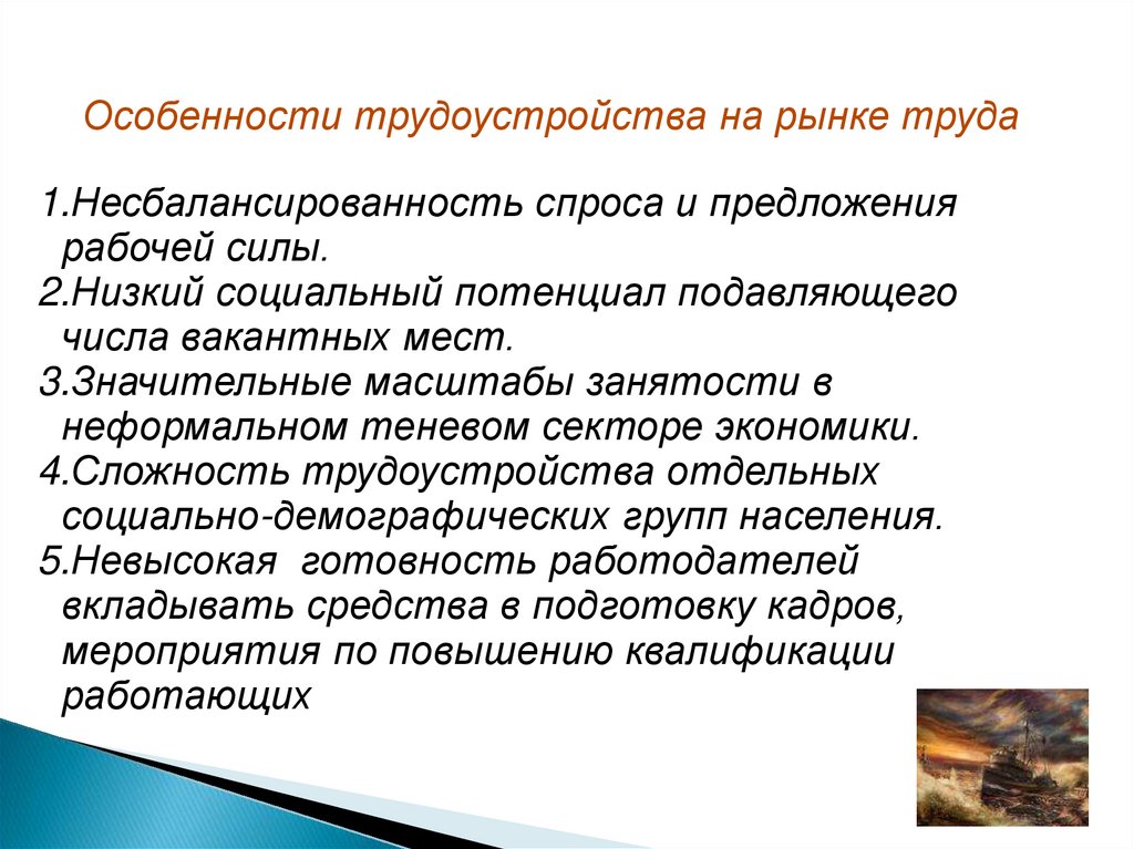 Особенности трудоустройства на рынке труда1.Несбалансированность спроса и предложения