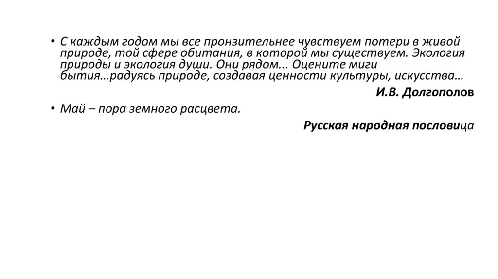 • С каждым годом мы все пронзительнее чувствуем потери в живойприроде, той сфере обитания, в которой мы существуем. Экология