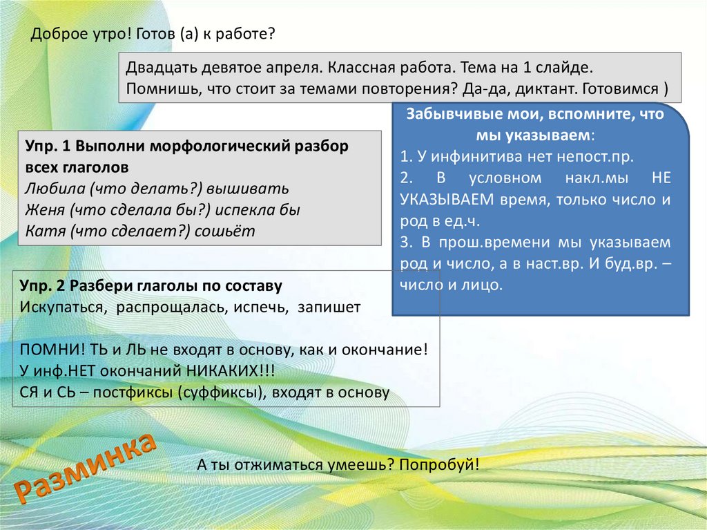 Доброе утро! Готов (а) к работе?Двадцать девятое апреля. Классная работа. Тема на 1 слайде.