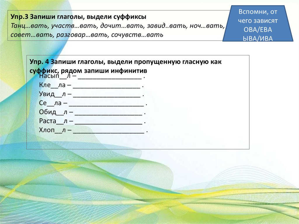 Упр.3 Запиши глаголы, выдели суффиксыТанц…вать, участв…вать, дочит…вать, завид..вать, ноч…вать,