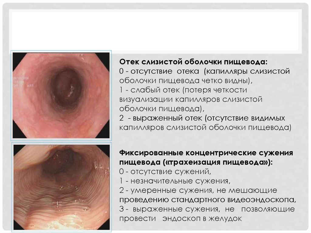 Отек слизистой оболочки пищевода:0 - отсутствие отека (капилляры слизистой