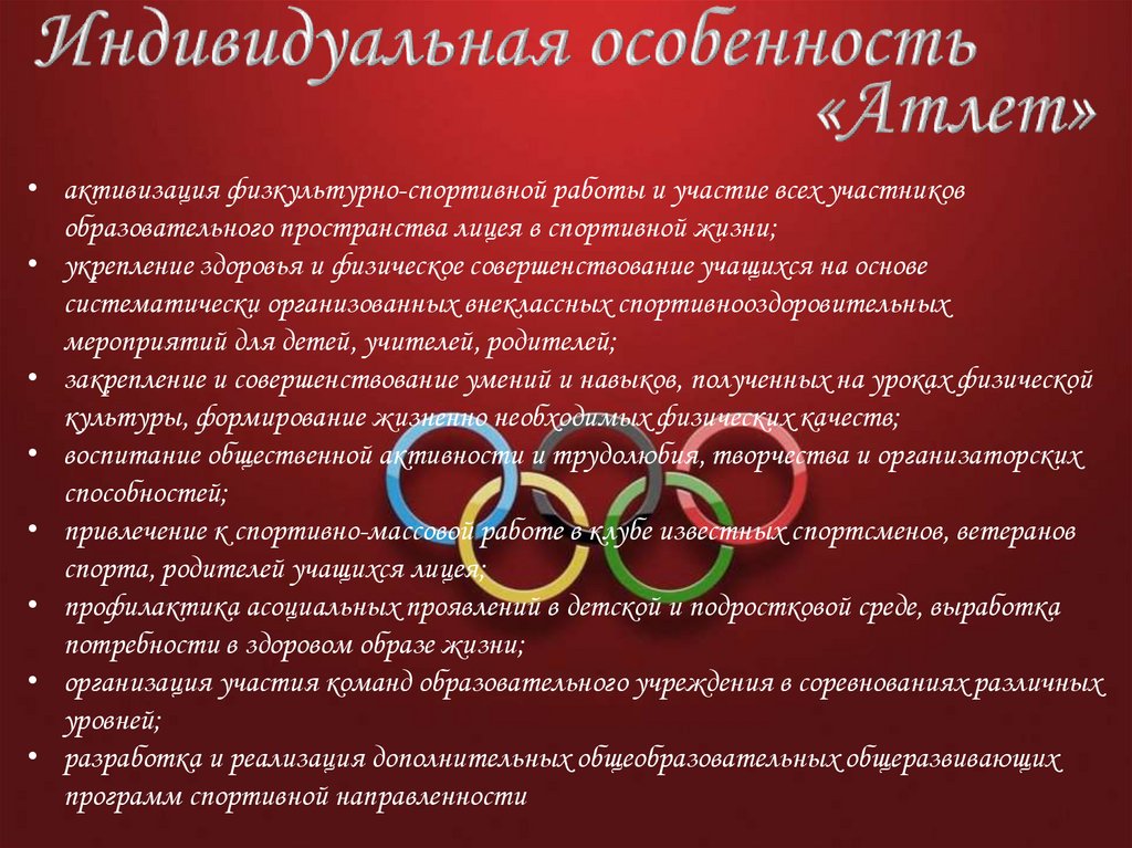 • активизация физкультурно-спортивной работы и участие всех участниковобразовательного пространства лицея в спортивной жизни;