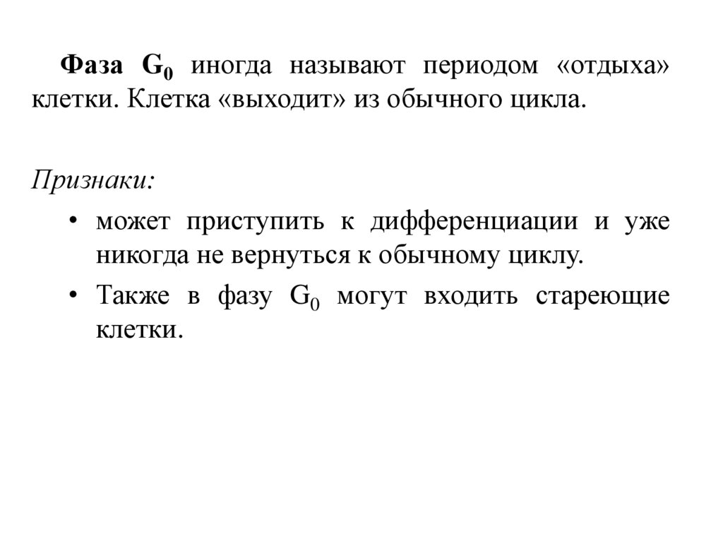 Фаза G0 иногда называют периодом «отдыха»клетки. Клетка «выходит» из обычного цикла.