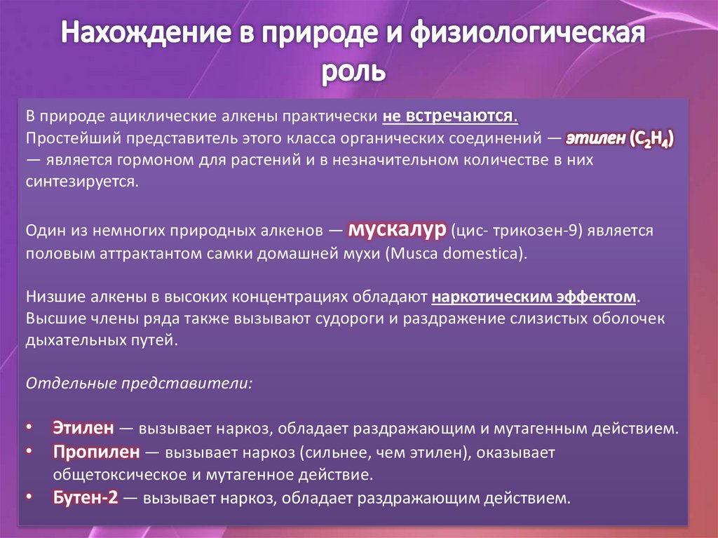 Низшие алкены в высоких концентрациях обладают наркотическим эффектом.
