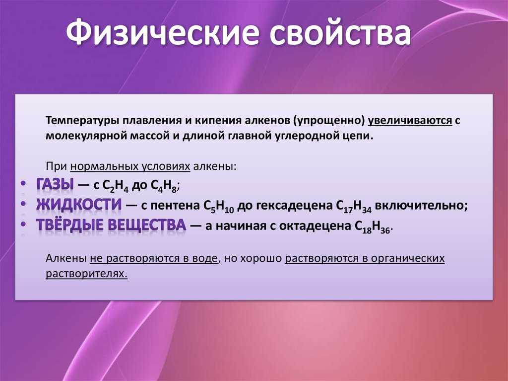 Температуры плавления и кипения алкенов (упрощенно) увеличиваются смолекулярной массой и длиной главной углеродной цепи.