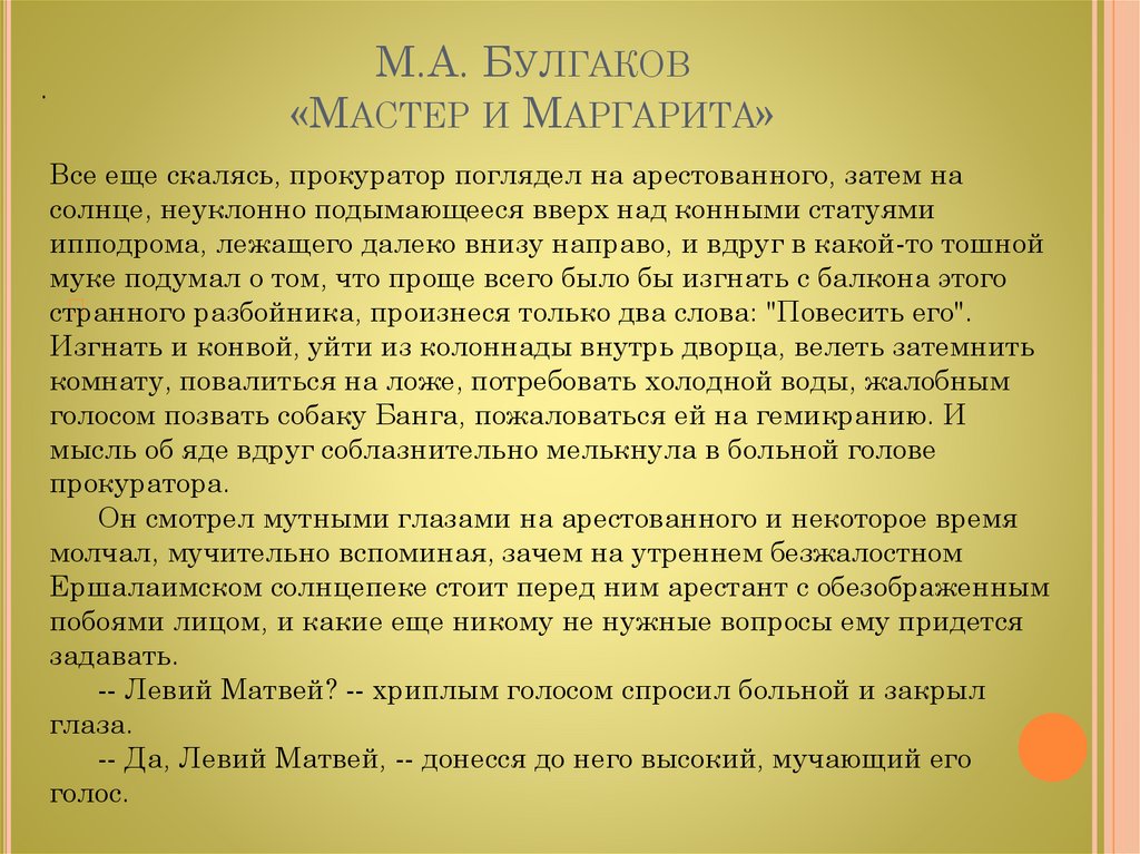 -- Да, Левий Матвей, -- донесся до него высокий, мучающий его