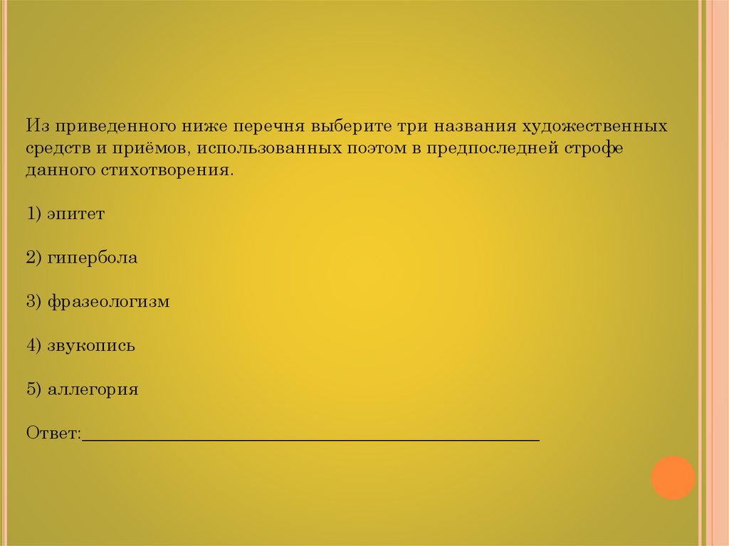 Из приведенного ниже перечня выберите три названия художественныхсредств и приёмов, использованных поэтом в предпоследней строфе