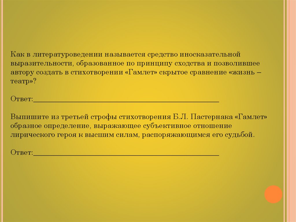 автору создать в стихотворении «Гамлет» скрытое сравнение «жизнь –